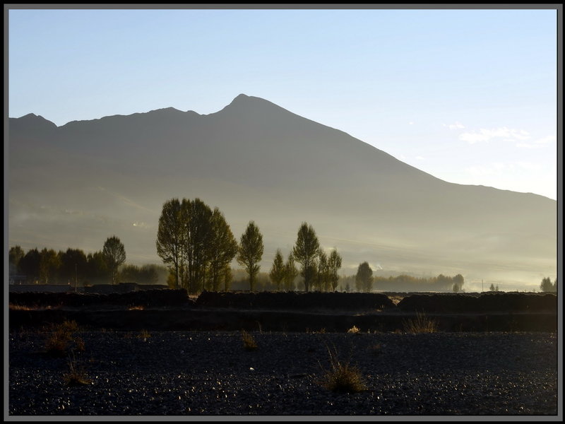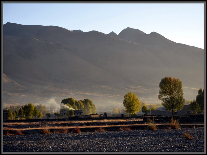 出一道優美的弧線。碧空如洗,陽光低低地斜射著,小河泛著粼光,金色的白樺樹葉在微風中輕擺,民居的屋頂上冒出縷縷炊煙,極目遠眺,貢嘎雪峰直刺蘭天,在高原燦爛的陽光下,毫不吝惜地展示她的自然亮麗,視野中藍色(天)、白色(塔)、金黃(白樺葉)、黑色(土地、?牛)、墨綠色(山影),交織成流暢的色彩線條,恍如置身油畫之中。怪不得這里被譽為“光與影的世界”、“攝影家的天堂”。