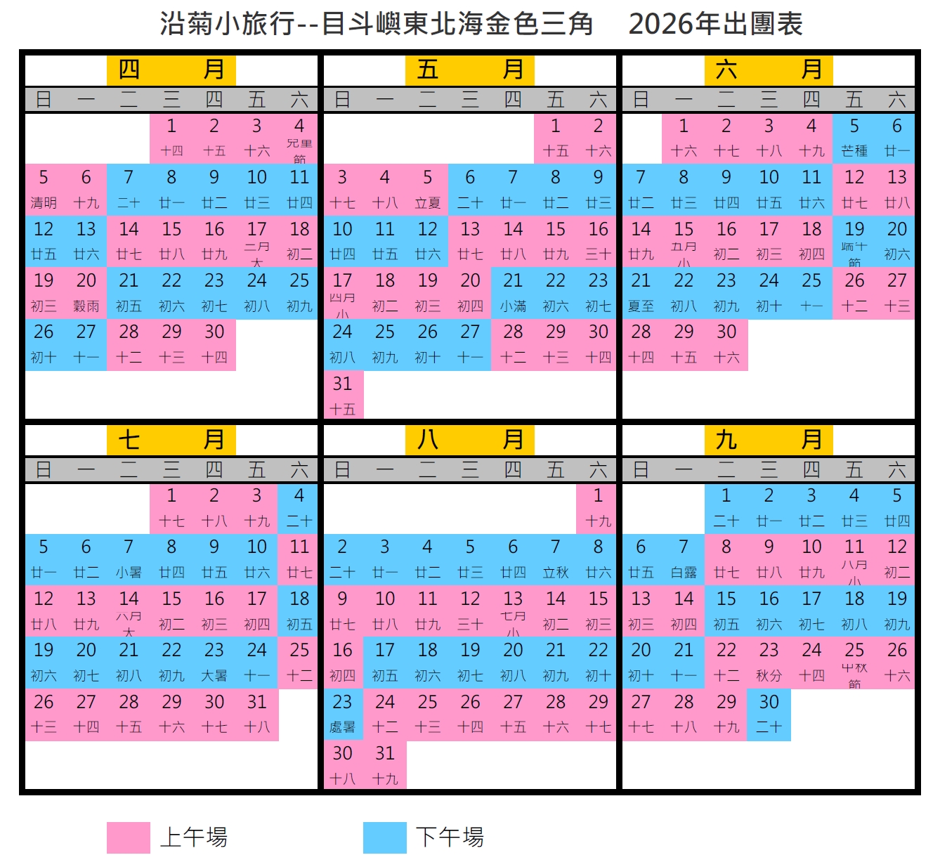 | 2026年出團日期 | 日期會因團體報名,隨時加碼場次!